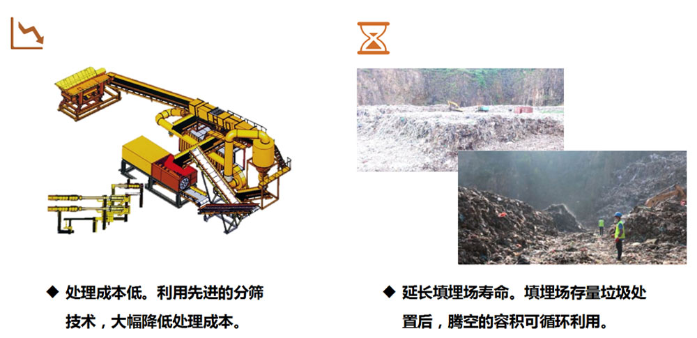 本技术通过彻底清除填埋垃圾,不再有污染产生,极大增强了周边居民的满意度,具备较高的社会效益,同时通过最优的设备、人力配置以及整合上下游处置企业,有效降低了分选和处置成本,具有较高的经济效益。